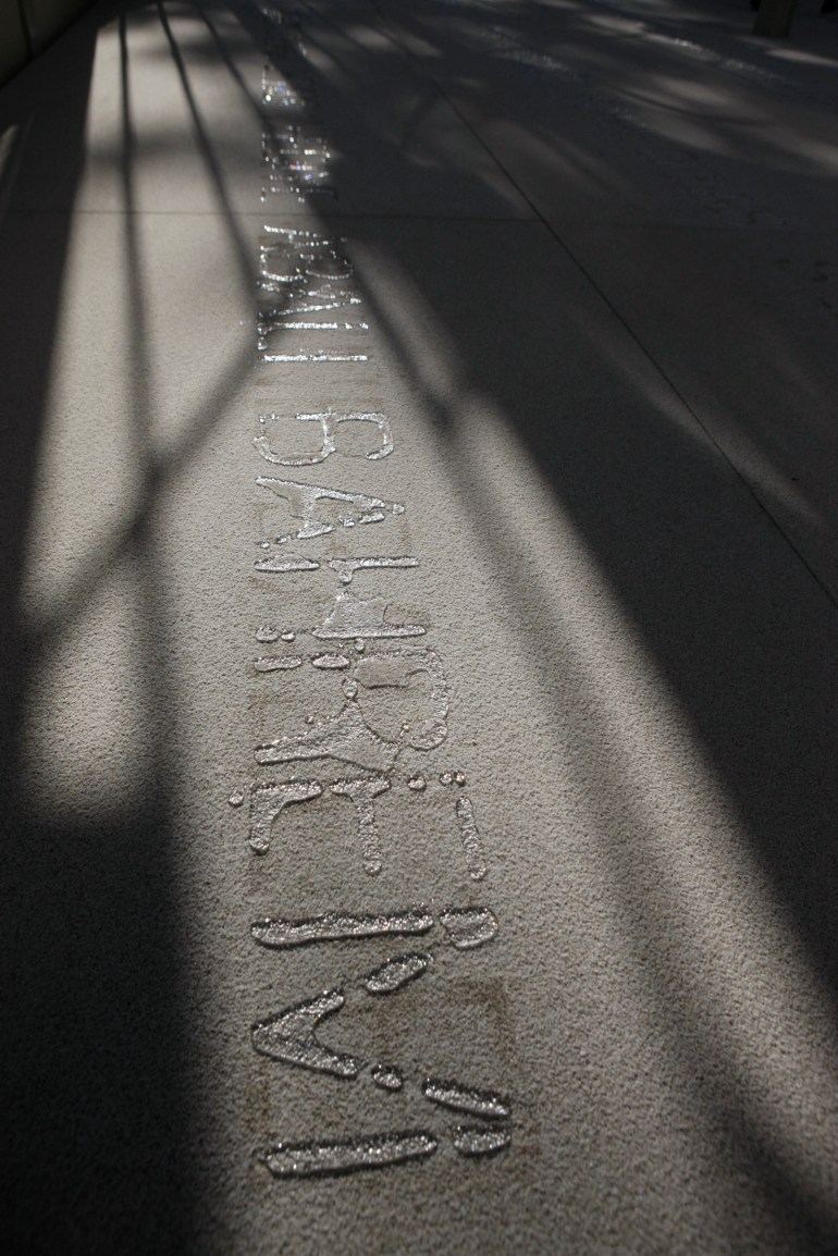 En la visita a la obra de Doris Salcedo en el Palacio de Cristal sentí que están pasando cosas muy sutiles y a la vez muy potentes. Se observan las letras en el suelo escritas con agua, que van mutando, se evaporan, cambian de lugar, brillan según la orientación del sol. Nunca es igual.