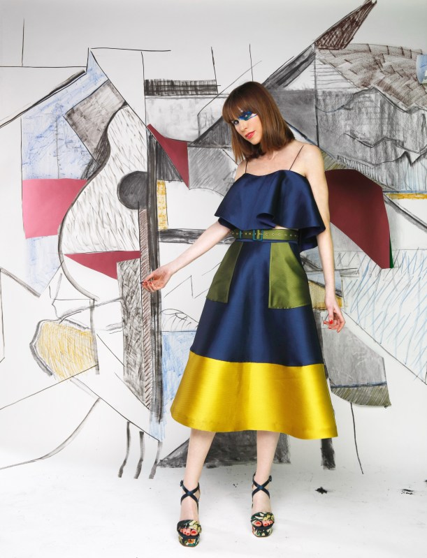 Vestido dos piezas azul, amarillo y verde con cinturón: Antonio García