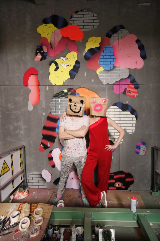 El artista Grip Face ha intervenido el hueco del ascensor. Al intervenirlo lo transforma, interactúa con el espacio que, al no estar ni en el interior ni en el exterior, se convierte en un limbo. Las figuras van transformándose, de cabezas figurativas a manchas de colores que nos evocan formas. El ascensor se convierte así en una cápsula que viaja a través de un mundo de colores, de formas y de figuras que se van componiendo, descomponiendo y transformando a medida que el ascensor sube o baja. Podemos decir que esta pieza está compuesta por tres fases: al principio se reconocen cabezas atadas que miran hacia delante y entre ellas no se miran. A medida que vamos subiendo se va modificando la pintura, el cabello y el rostro se mantienen como identidad humana, pero el resto va mutando en formas y manchas de color. Observando la pieza desde arriba, las formas y los volúmenes plásticos dan sensación de movimiento. De esta manera, el lenguaje de formas de Grip Face se va haciendo cada vez menos figurativo, menos reconocible a medida que vamos ascendiendo. Las cabezas se hacen cada vez más pequeñas, se van amontonando unas encima de otras y transmutan. En una última fase vemos formas de color y cabellos que le dan el tono humano, rostros que ahora se miran con miradas vacías… ¿Qué expresa Grip Face con su arte?