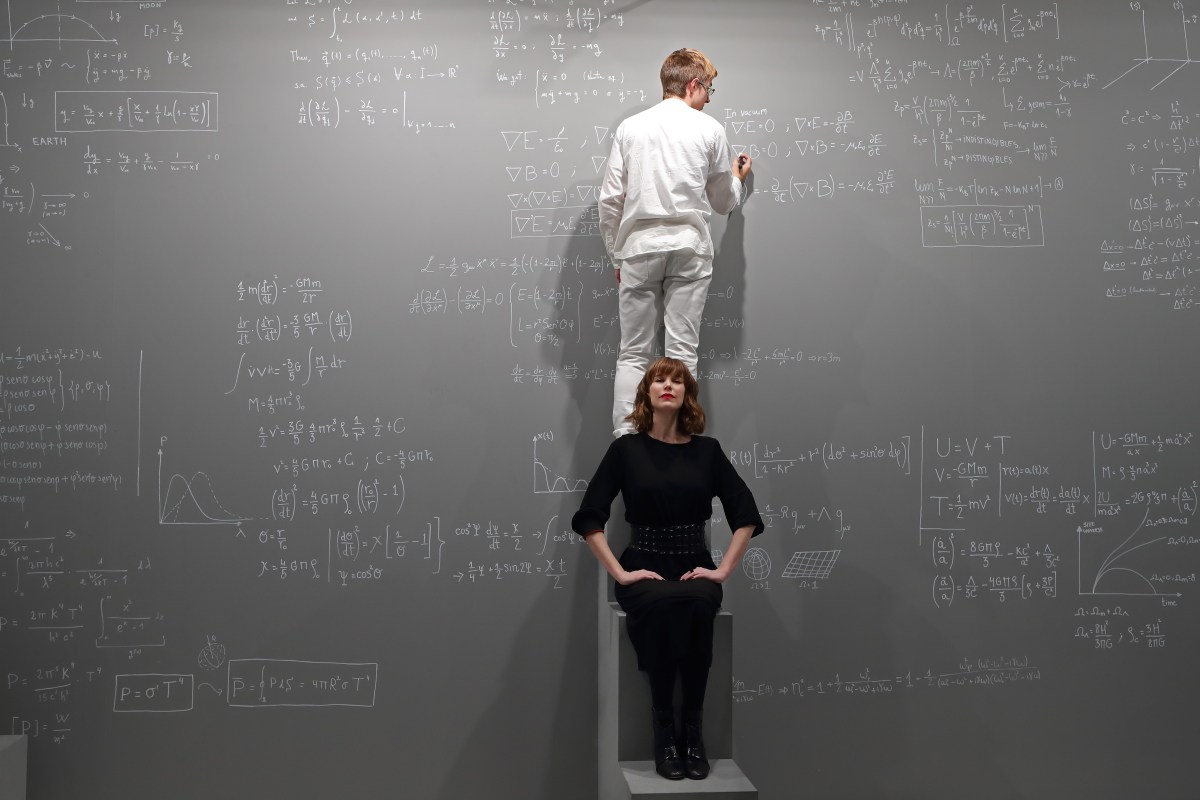Experiencia uno: foto uno. Instalación creada por Andrea Galvani, The Ryder. El artista, ganador del premio de este año en Arco de Audemars Piguet,  explicó su obra: “Las matemáticas son un lenguaje universal y esta instalación es el anhelo de retratar las cosas que no se ven con el lenguaje de las matemáticas. Por ejemplo, una Supernova, que nosotros no podemos ver, pero sí puede ser reproducida con una fórmula matemática”. En la instalación las fórmulas matemáticas son escritas por performers mientras que el espectador es invitado a ser testigo de un ritual en el que se hace visible lo que no podemos ver.