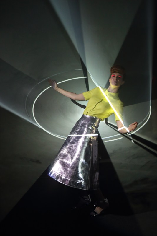 Entramos en una habitación a oscuras que funciona casi como un túnel del tiempo. En él son proyectados dos haces de luz horizontal en movimiento rotatorio. Con el humo artificial que surge de una máquina, todo aquello adquiere una apariencia tridimensional, creando una escultura de luz. En el fondo de la estancia, emerge un espejo donde el espectador se observa irradiado y entremezclado. Es ahí donde surgen efectos inesperados; una obra que nunca va a ser igual, pues con cada abrir y cerrar de ojos aparece cambiante, inmaterial, mutante.