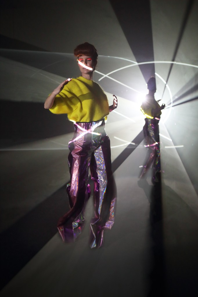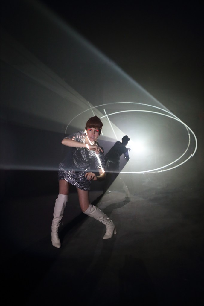 We step inside a dark room which serves almost as a time tunnel. Horizontal rays of light are projected in rotating movements. With the theatrical smoke emerging from a machine, the whole scene takes on a three-dimensional appearance, creating a sculpture of light. At the back stands a mirror where the viewer can observe themselves reflected and fused with the surrounding space. Here, there are unexpected effects; this work is never the same, with every glance it appears changed, immaterial, mutating.